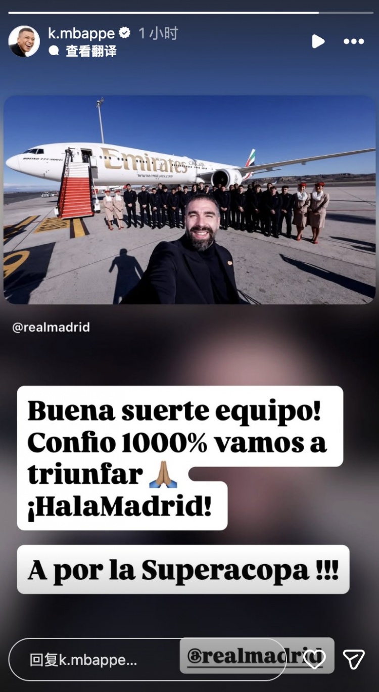 1月7日讯 本周二,皇马前锋姆巴佩在个人INS上发布快拍,祝福球队赢得西班牙超级杯。